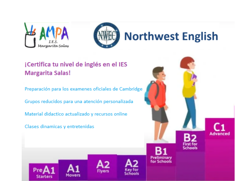 El AMPA del IES Margarita Salas trabaja conjuntamente con Northwest English, academia de inglés líder en preparación de la titulación de inglés de Cambridge English. Nuestros profesores son Examinadores Oficiales y verdaderos expertos que podrán ofrecerte la mejor preparación para conseguir tu titulación oficial.